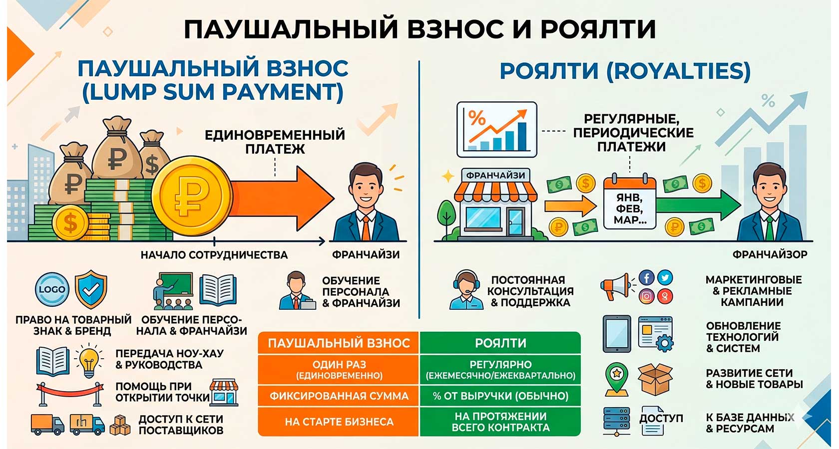 Разберем два главных рычага: паушальный взнос (входной билет) и роялти (подписка на успех).